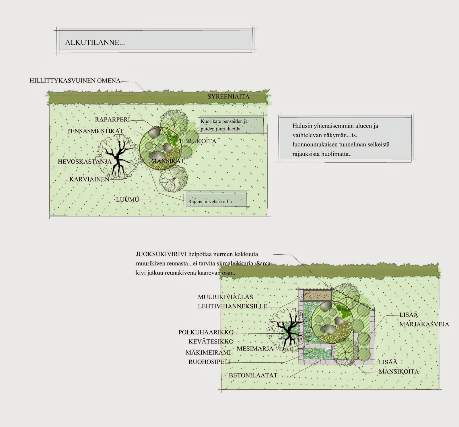 Samalla jaan vähän omia pihasuunnittelun perusteitakin...Itselle usein ns. rutiinin myötä itsestäänselvät asiat ovatkin ensimmäistä kertaa pihaa suunnitteleville täysin uusia juttuja. Ja harmikseni olen pari kertaa huomannutkin, että en ole tarpeeksi alusta asti lähtenyt juttua selittämäään. Kuitenkin yleensä palaute suunnittelu-asiakkailta on kiitokset selkeästä, mutta yksilöllisestä suunnitelmasta.